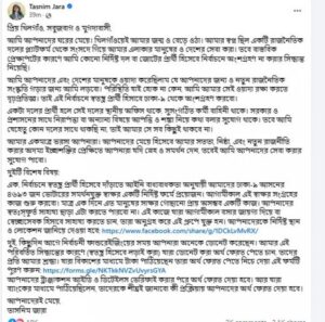 পোস্টের শেষে প্রার্থী হওয়ার ক্ষেত্রে ‘দুটি বিশেষ বিষয়’–এর কথা বলেছেন তাসনিম জারা। প্রথম বিষয় হিসেবে তিনি লিখেছেন, ‘নির্বাচনে স্বতন্ত্র প্রার্থী হিসেবে দাঁড়াতে আইনি বাধ্যবাধকতা অনুযায়ী ঢাকা-৯ আসনের ৪ হাজার ৬৯৩ জন ভোটারের সমর্থনযুক্ত স্বাক্ষর একটি নির্দিষ্ট ফর্মে প্রয়োজন। আগামীকাল (রোববার ) এই স্বাক্ষর সংগ্রহের কাজ শুরু করব।’